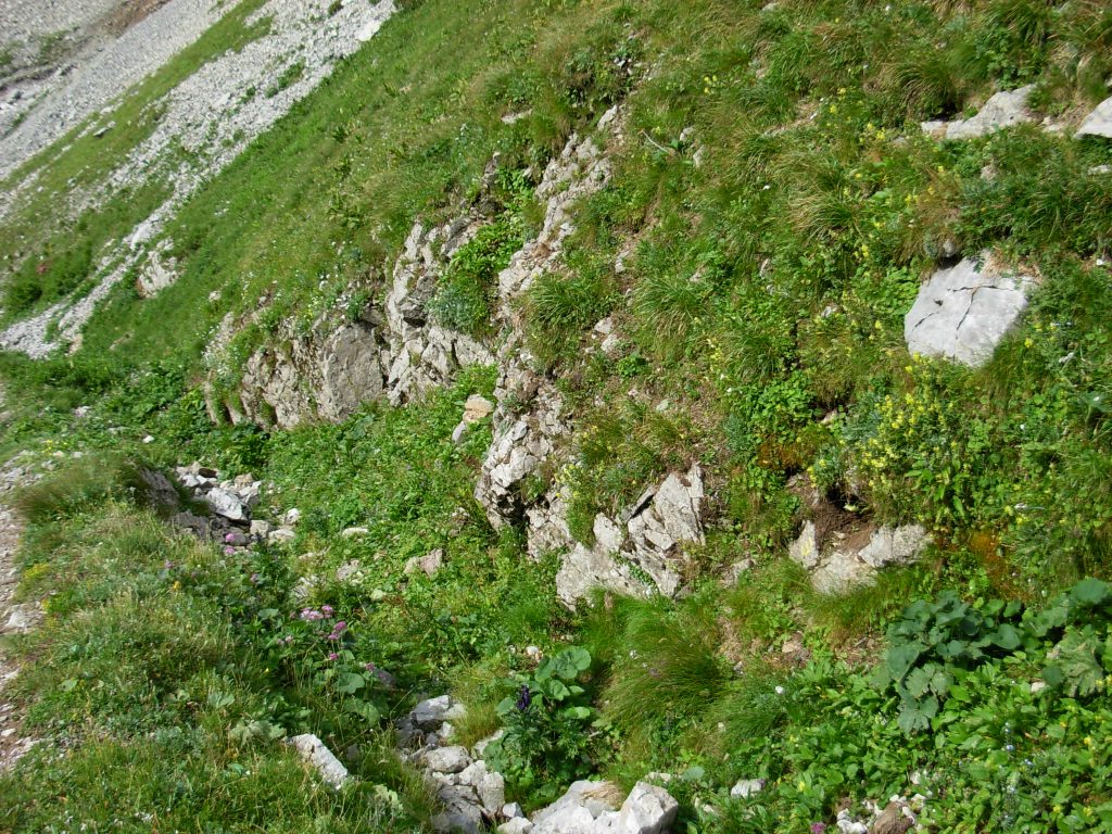An interesting point is 100 meters far from here, in direction South-West, outside the route. There is a trench dug during the 1st WW. The grey limestones of the Wolayer Formation are in direct contact with the red ones of the Cocco Formation. The former are around 450 million year old, the latter 430. The sediments deposited in this time span are therefore missing. This lack is probably due to a lifting of the sea floor and an almost simultaneous lowering of the sea level during a glacial phase. The Cocco Formation rocks are rich in orthoceratids. In the Limestone of Volaia there are many fossil remains of peduncles and arms of cystoids (similar to sea lilies).