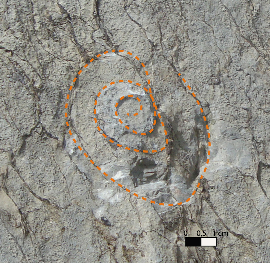Arrived to this point, we can clearly distinguish spiral-shaped fossils in the rocks: they are Goniatites dating back to the Devonian period, about 370 million years ago. These are the extinct ancestors of Ammonites. The remains of Conodonts’ teeth, unfortunately not visible to the naked eye, are geologically much more significant. The teeth are the only fossilised remains of these sea inhabitants, now extinct. They are very useful for dating the rocks in a precise way, since they have evolved in a rather short time. Despite this, the Conodonts remained a mystery for more than 100 years, until 1983, when the fossilised remain of a whole animal was found for the first time. Thanks to this discovery we know that Conodonts were 4-5 centimetres long and looked vaguely like an eel.