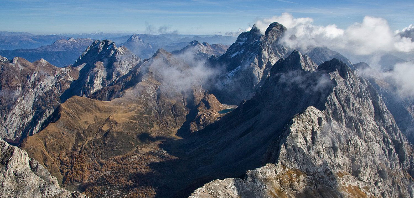 The mighty ramparts of Creta della Chianevate (2769 m. asl) and of Mount Coglians (2780 m asl) are the highest peaks of the Carnic Alps. The southernmost glacier of Austria, the Eiskar, is here as well. The Chianevate formed in the Devonian (415-360 million years ago), over a time span of 30 million years. The lower part of the wall has evident layers, deposited in a relatively shallow sea. On the other hand, in the upper part there are massive rocks representing the actual body of a growing reef. The fold in the middle part of the wall is related to more recent tectonic movements. To the north, the reddish rock of Mount Rauchkofel is typical of open sea deposits.