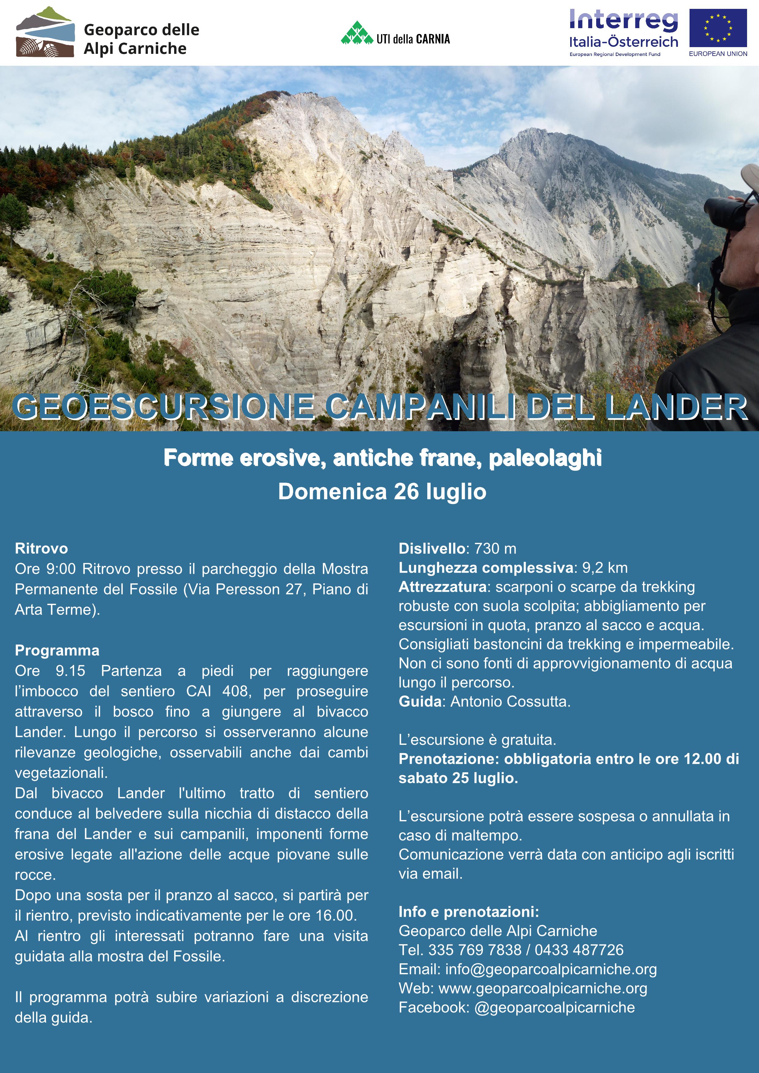 Iscrizioni entro: sabato 25 luglio ore 12 all’indirizzo email info@geoparcoalpicarniche.org , lasciando un contatto telefonico e il numero di persone che parteciperanno